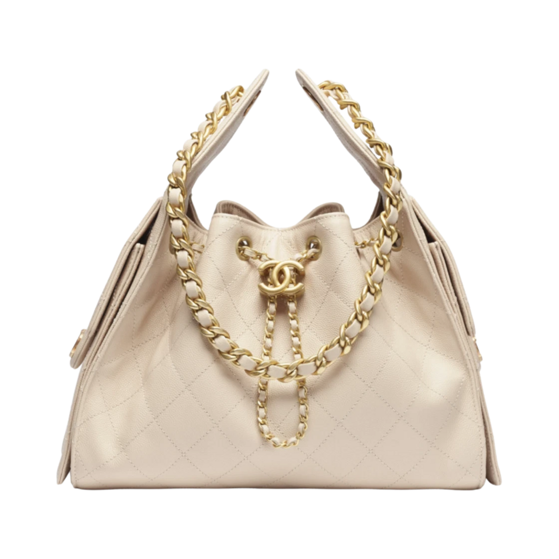 Material: Luxurious grained calfskin leather Hardware: Elegant gold-tone metal accents Color: Timeless beige for versatile...