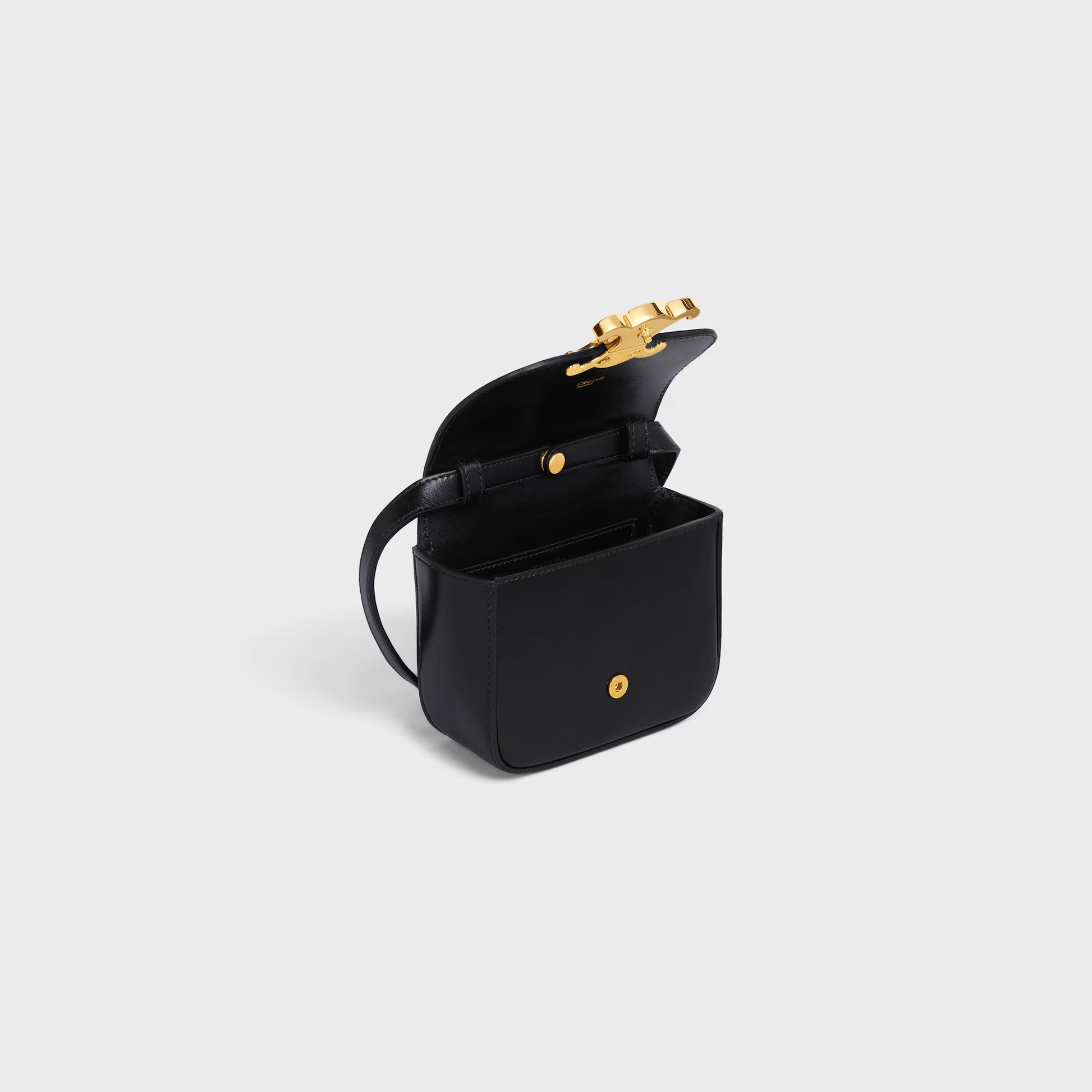TO ENSURE A COMFORTABLE CARRY, THE STRAP SHOULD BE ATTACHED UNDER THE FLAP THROUGH THE LEATHER LOOPS THANKS TO A SNAP BUTTON