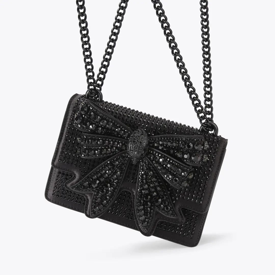 The Small Shoreditch Cross Body is crafted from a black satin. The front flap is topped with large, crystal bow and black eagle head with crystal detail on the front flap.